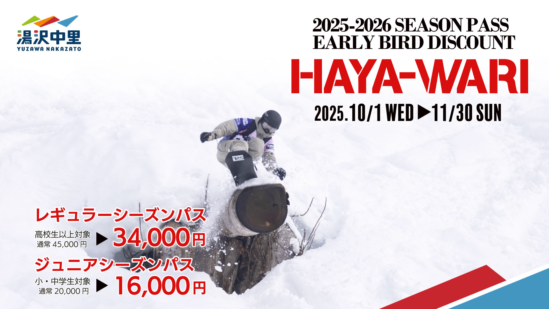 湯沢中里レギュラーシーズンパス(高校生以上): 通常価格 45,000円 → 34,000円(税込)